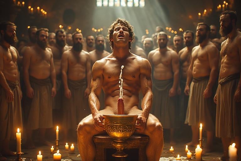 At the climax of the ceremony, observed by his fellow brothers, the initiate ejaculates hands free into the sacred goblet. Afterward, each brother will, in turn, step forward and contribute their own offering to the cup. The initiate will drink, and finally, he becomes a member of the order.