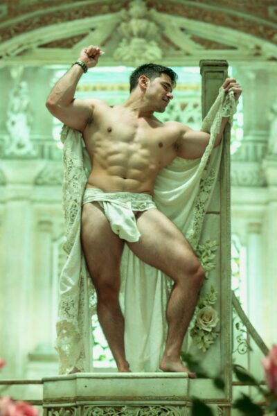 4538 votes Photo of a man modeling in a surreal temple full of roses