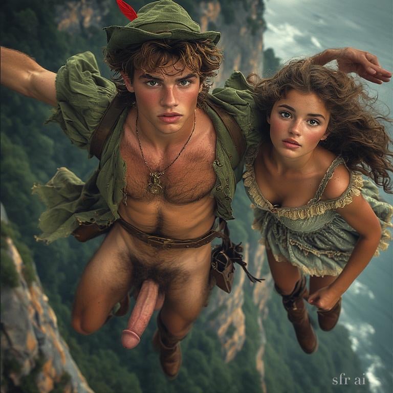Prompt: Peter Pan finally grew up. He's now a hot, hunky 20-year-old with hairy pubes. He's flying through Never-never Land. He still wears the hat, tunic, and boots, but nothing else, and huge, veiny cock is sticking out. Wendy, also now grown up and filling out her nightgown nicely, flies next to him