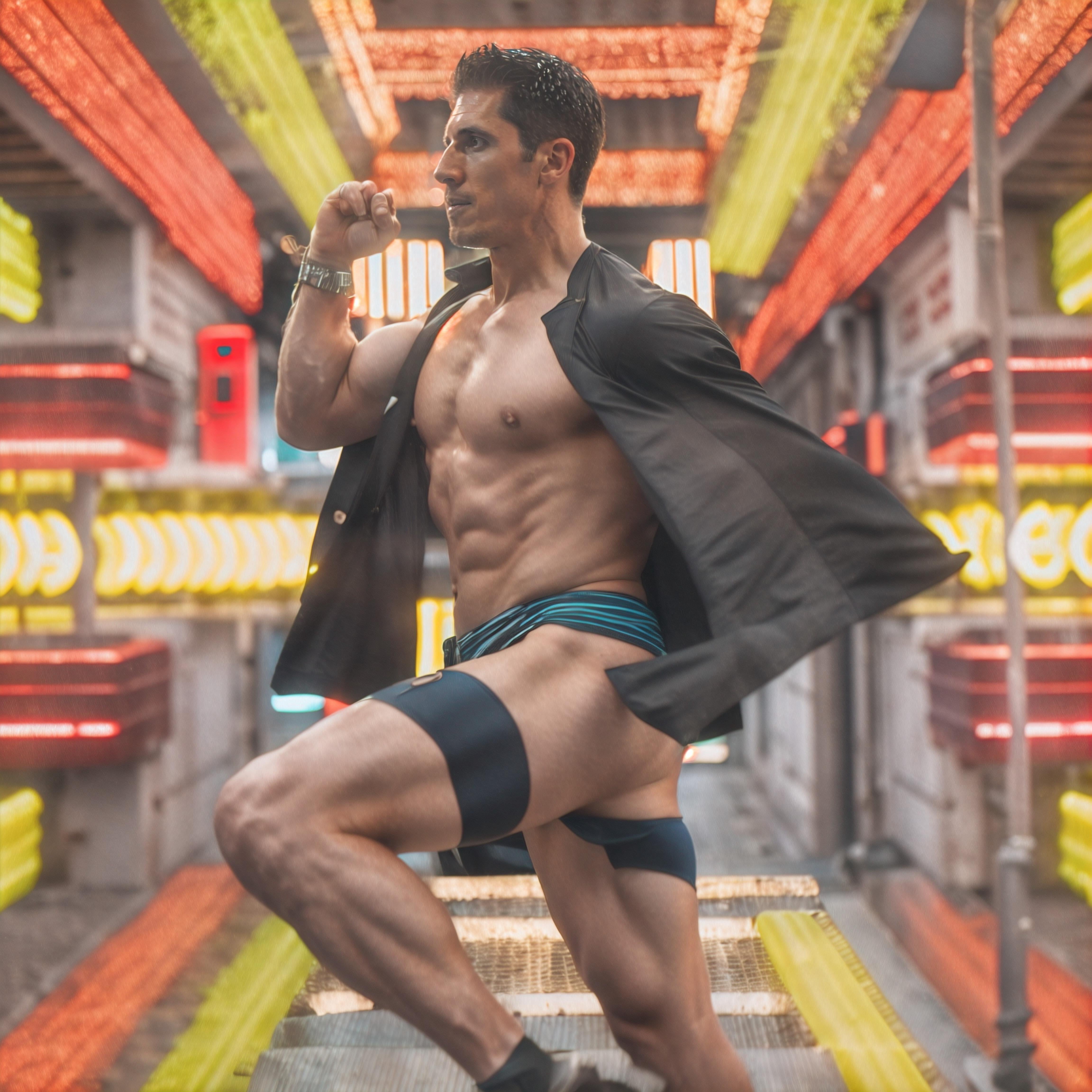 Photo of a man modeling in a neon beach