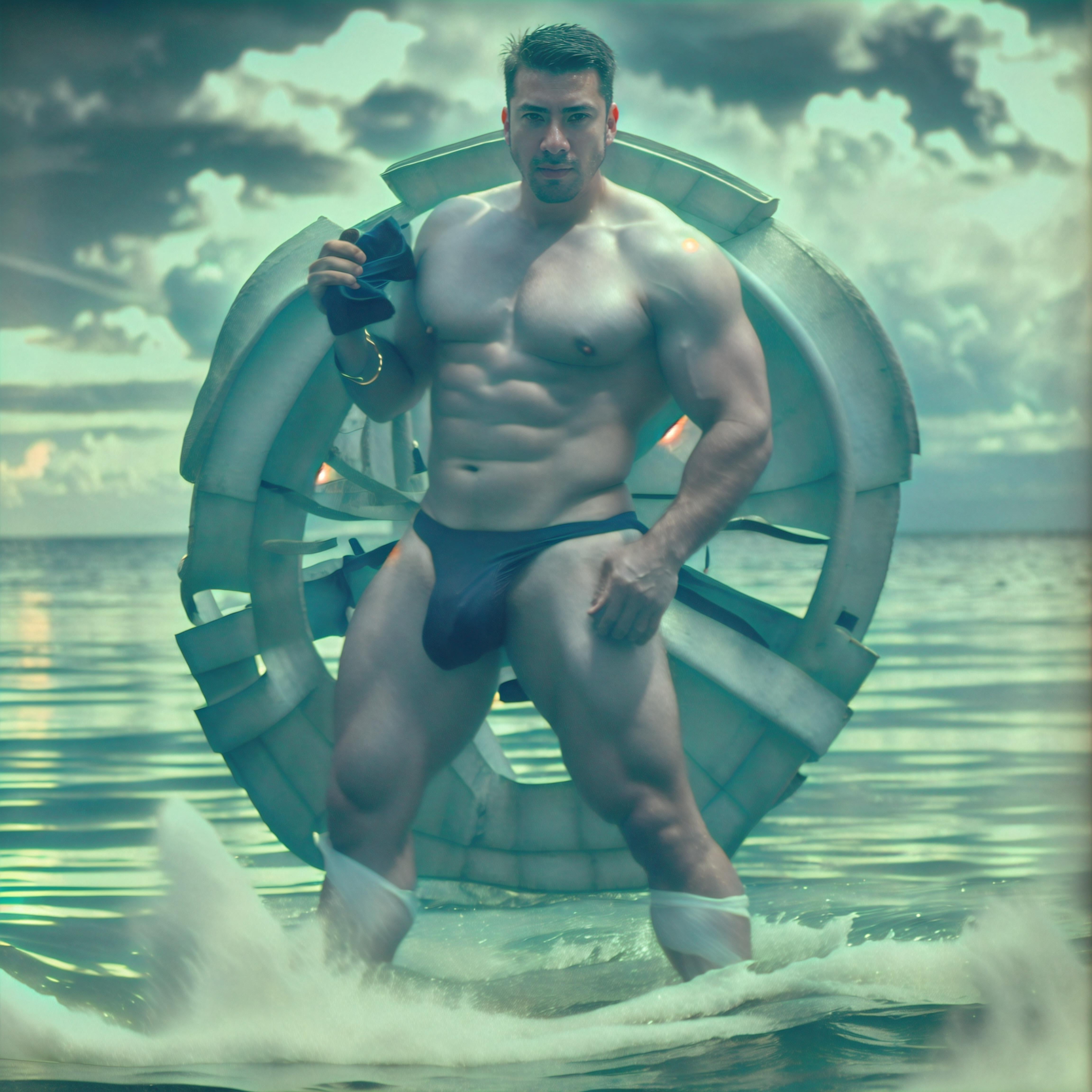 Photo of a man modeling in a surreal beach