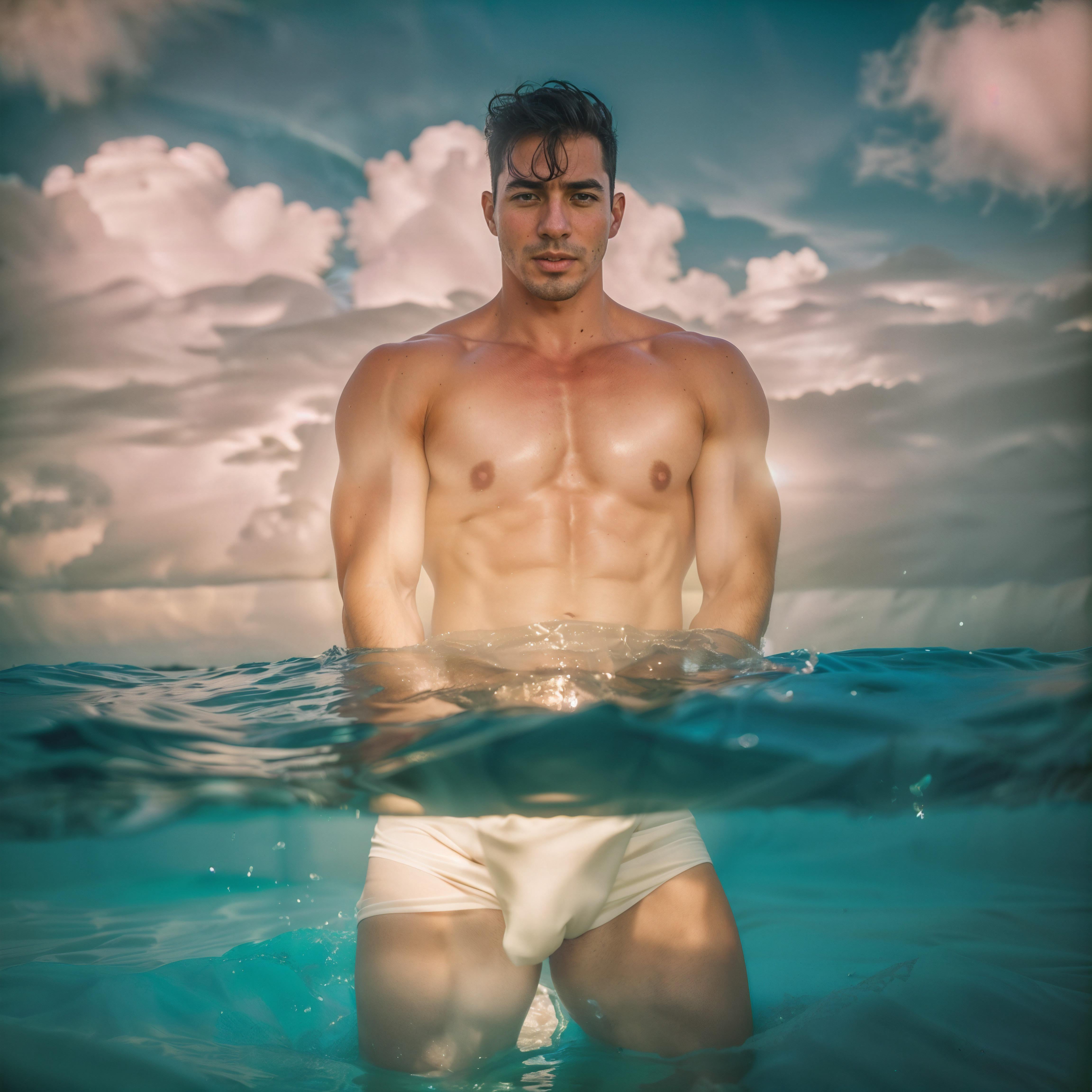Photo of a man modeling in a surreal beach