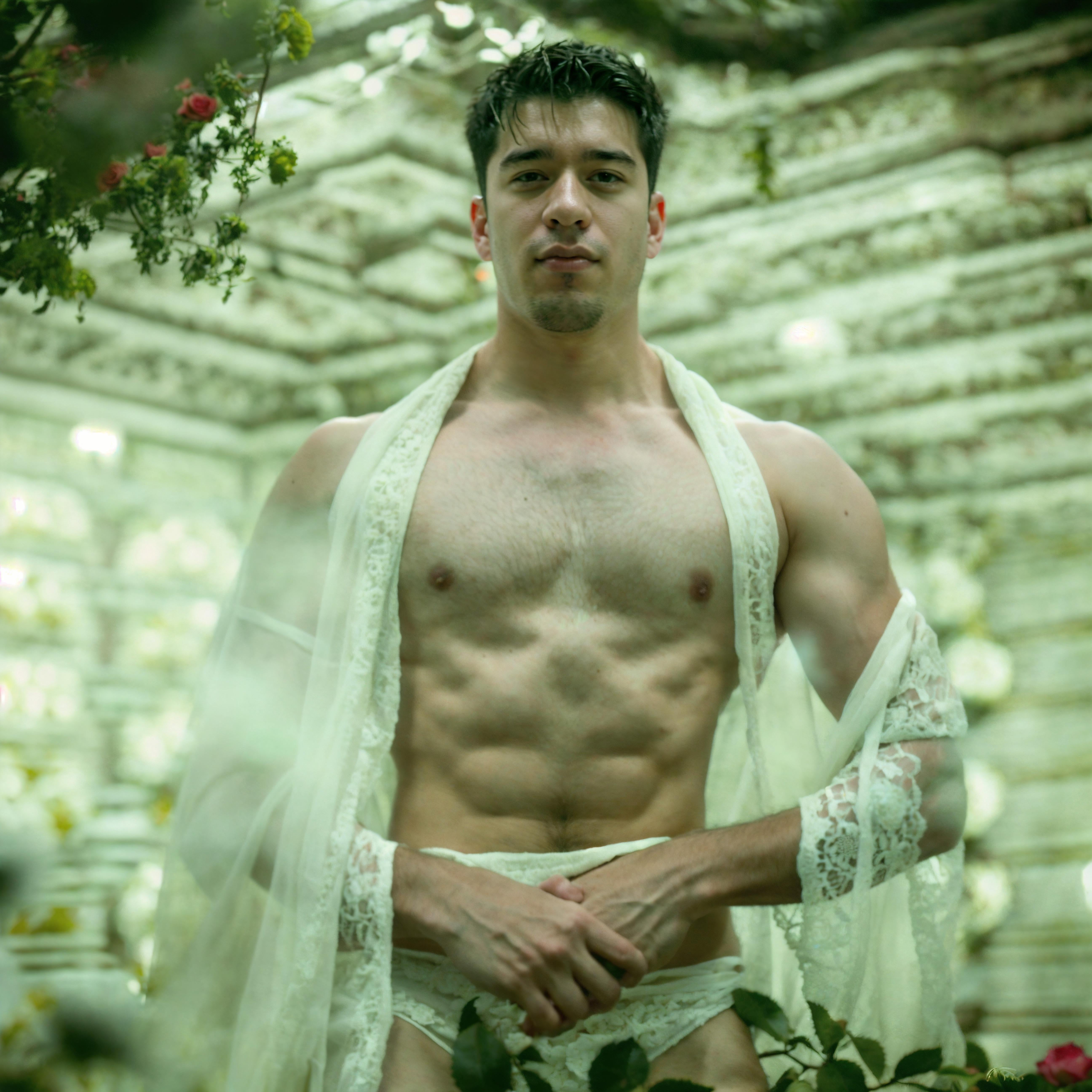 Photo of a man modeling in a surreal temple full of roses
