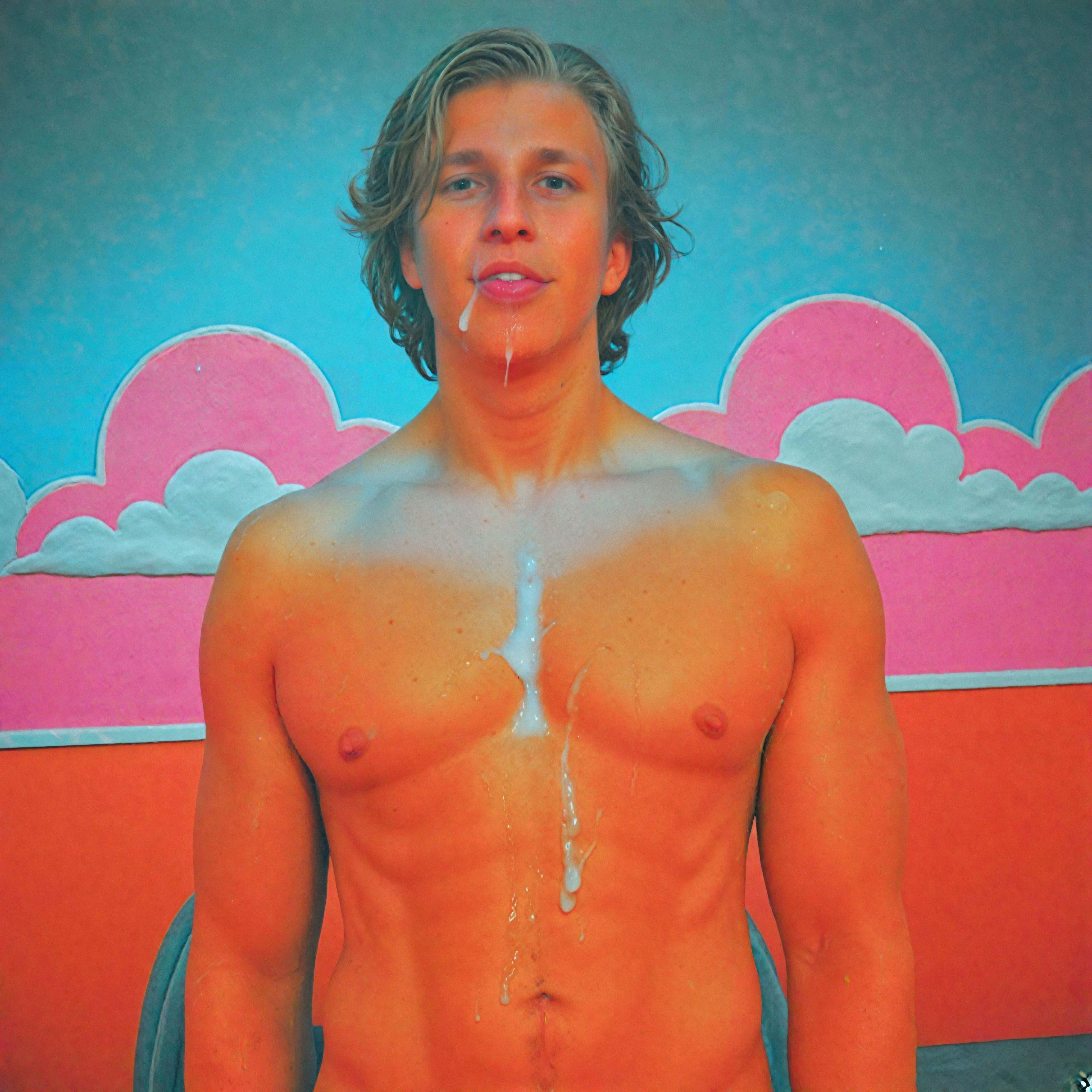 Portrait of a man modeling naked covered with cum in rococo set