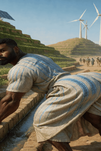 6270 votes Wednesday, March 4th, 2026 Solarpunk desert man clothes are blown away left embarrassed! 1