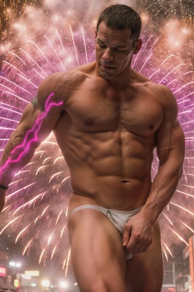 4890 votes Photo of a man modeling with fireworks in the background